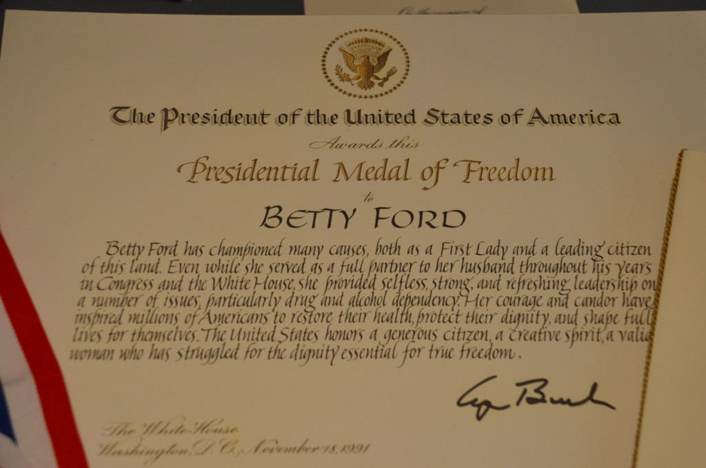 Exhibit featuring the certificate awarded to Betty Ford along with the Presidential Medal of Freedom in 1991 [library]